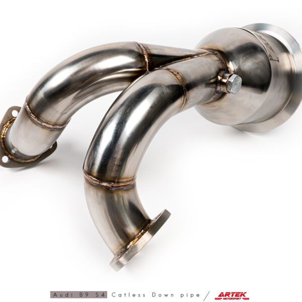The ARTEK Audi B9 S4 Catless Down pipe is a high-flow stainless steel exhaust downpipe that replaces the restrictive factory catalytic converter, improving exhaust gas flow for performance gains. Constructed from T304 stainless steel with included install hardware (gaskets not included), this catless design is intended to maximize output and reduce backpressure. May affect emissions compliance.
