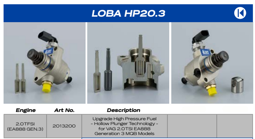 We take a brand new factory OEM pump for reliability, then we make fundamental changes using new components and processes by LOBA to create this upgrade fueling solution. Upgrade High Pressure Fuel – Hollow Plunger Technology for VAG 2.0 TSI EA888 Generation 3 MQB Models The LOBA HP20.3 high-pressure fuel pump for 2.0 T (F) SI EA888 Gen.3 MQB increases fuel flow and can support more than 220 bar.